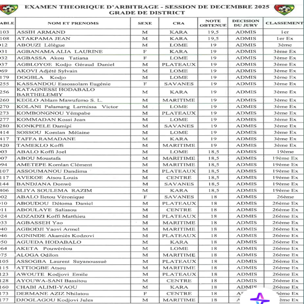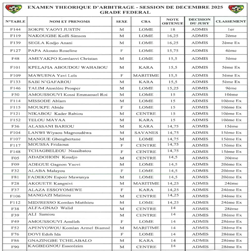 Les résultats, signés par Antoine K. Sédjro, président de la Commission Centrale des Arbitres (CCA), et Claude K. Djaoupé, chef du Département d’Arbitrage à la Fédération Togolaise de Football, viennent couronner une année d’efforts coordonnés. Les Centres de Formation des Arbitres (CFA), sous la supervision des Commissions Préfectorales des Arbitres (CPA) et Régionales (CRA), ont assuré un encadrement technique rigoureux, condition sine qua non pour élever le niveau global.