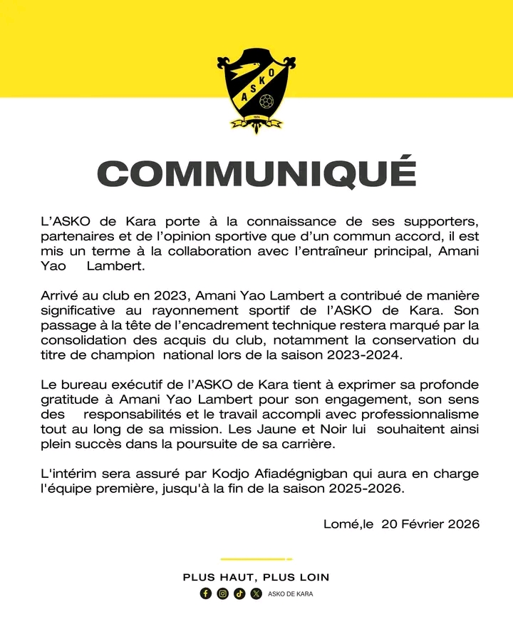 C’est une décision forte alors que la phase retour du championnat va démarrer. L’ASKO de Kara a officialisé ce vendredi 20 février 2026 la fin de sa collaboration avec son entraîneur principal, Amani Yao Lambert.