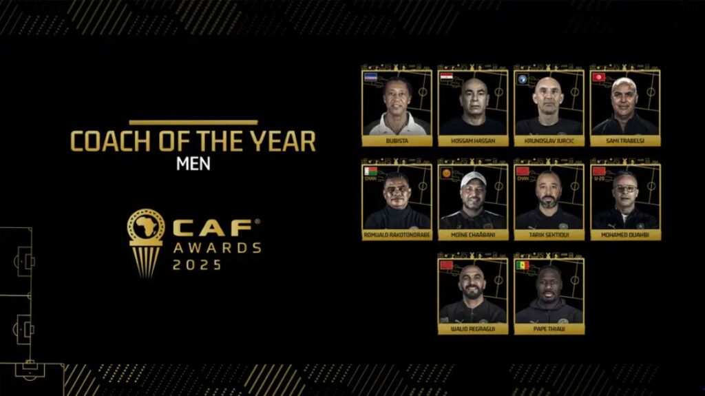 Un mélange éclectique de tacticiens représente les meilleurs esprits du football africain. Bubista (Cap-Vert) est reconnu pour avoir guidé son équipe vers une ascension continue dans le football africain et vers la qualification pour la Coupe du monde de la FIFA, tandis que Hossam Hassan (Égypte) et Walid Regragui (Maroc) figurent à nouveau parmi les favoris après avoir mené leurs équipes vers des périodes couronnées de succès. Les autres nominés sont Krunoslav Jurcic (Pyramids FC), Tarik Sektioui (Maroc CHAN) et Pape Thiaw (Sénégal).