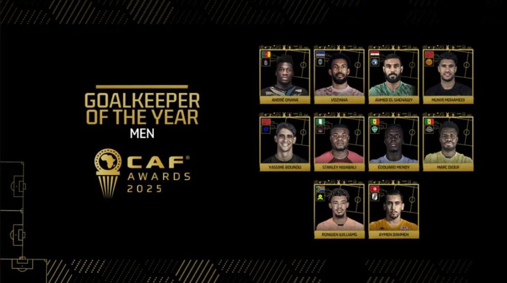 La catégorie des gardiens de but se caractérise par un mélange d’expérience internationale et de stars montantes. Yassine Bonou (Maroc/Al Hilal) figure en tête d’une liste prestigieuse grâce à ses performances régulières en club et en sélection nationale, tandis que Stanley Nwabali (Nigéria/Chippa United) et le tenant du titre Ronwen Williams (Afrique du Sud/Mamelodi Sundowns) sont les autres nominés.